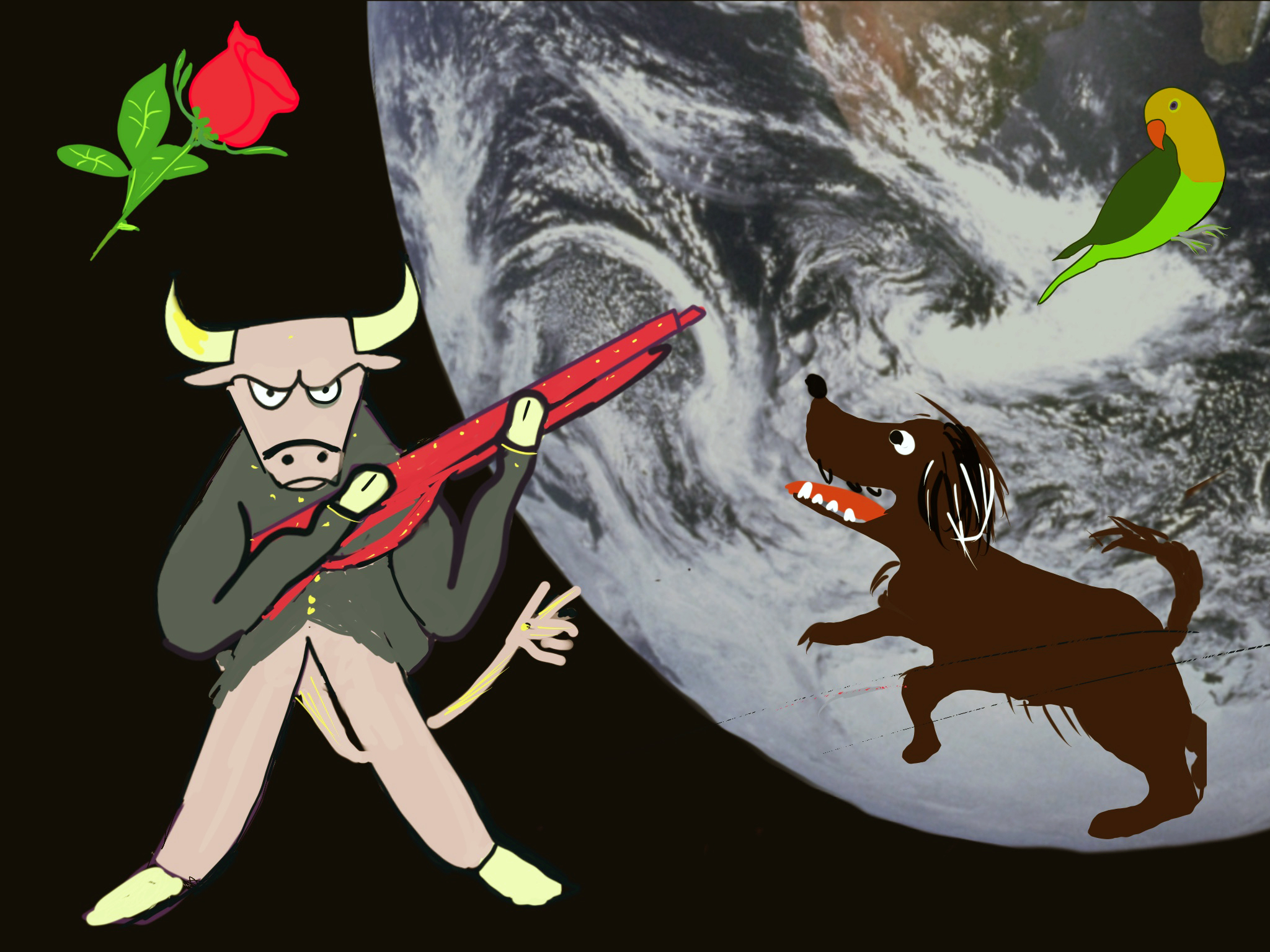 I did not like the sound of that, and I soon saw the animals he was talking about. And unfortunately, they saw me. These bulls were the size of Earth Elephants and stood on hind legs wearing helmets with their golden horns sticking out. They were carrying nasty looking weapons that were something like a cross between a gun and a baton. As we approached, two of them began to stamp and snort at me. They did not seem to notice the parrot who sneakily fluttered overhead.