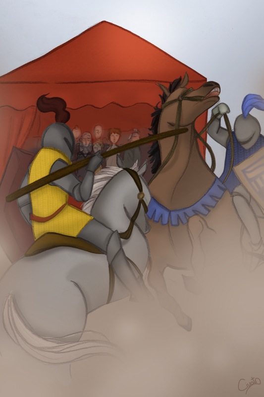 “Oh no!” exclaimed Sally, as her champion was pushed off his horse by a lance from behind. As he lay on the ground, it was clear that he was in need of some medical attention, and Sally was afraid that he would be trampled underfoot, but the horses seemed to know not to step on the bodies lying on the field. His assistants soon came and dragged Sally’s shining knight, semi-conscious, to the side.