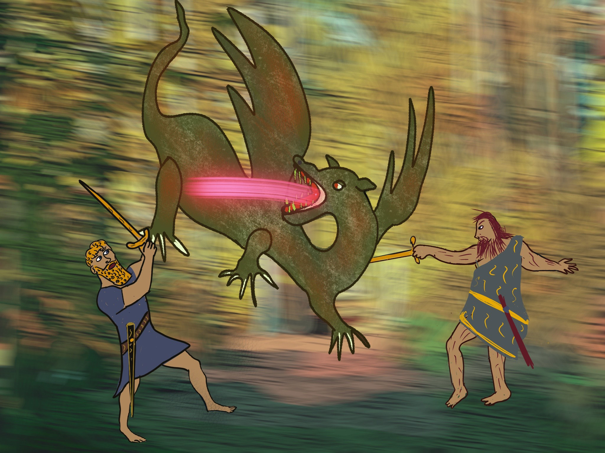 And hearing the voice of the sun god, Gilgamesh and Enkidu burned for the fight. They drew their swords from their sides and rushed headlong into the woods to meet Humbaba the dragon who was a terror to the people. They struck at the dragon’s feet and then they struck at his head while Shamash the sun god sent whirlwinds and tempests to knock Humbaba this way and that. Finally their weapons brought the dragon down, and gasping for breath, the evil one pleaded: