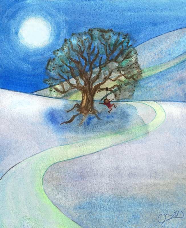 A few minutes went by and then a wild wind started to blow. As it shrieked and moaned, the poor little sufferer was blown to and fro like the hammer of a bell. The rocking made him seasick and the noose, becoming tighter and tighter, choked him. Little by little a film covered his eyes.