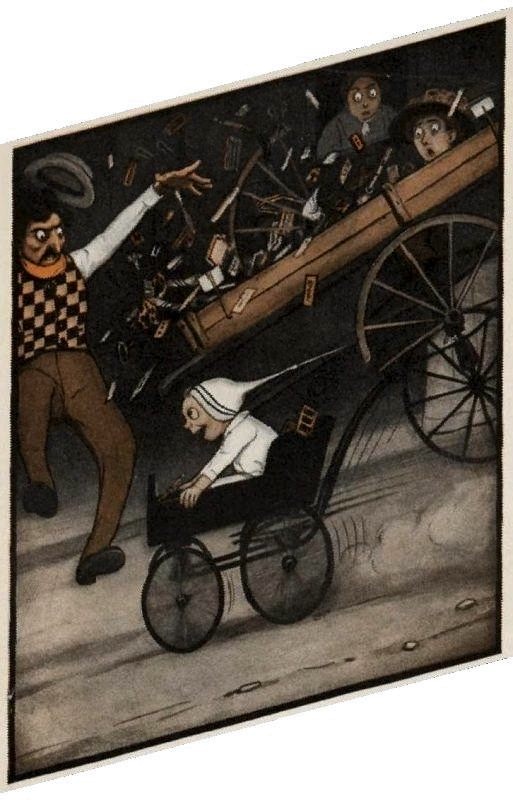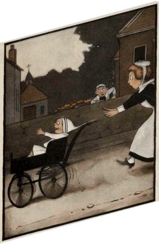 The story, told in verse, is about an infant in a pram that runs away down the hill. The pram practically becomes a go-cart and causes all sorts of funny mayhem on the way. It's almost like a cartoon in verse - only animation had not been invented at the time it was written.