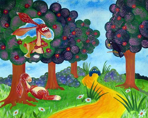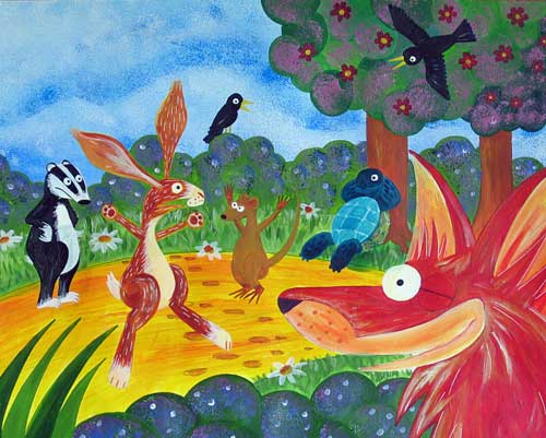 Of course almost everyone was backing me to win. You only had to look at me -lean, fit, with a terrific bounce in my step. And then look at HIM – an old, cabbage head, with a great shell on his back. I was the clear favourite. Only the fox was backing the tortoise. He was taking bets off his cronies, the badger and the rat. If I won, he would do them a month of services and favours. And if the tortoise won, they would have to work for him for a whole month. The badger and the rat thought the fox must have gone soft in the head to make such a silly bet.
