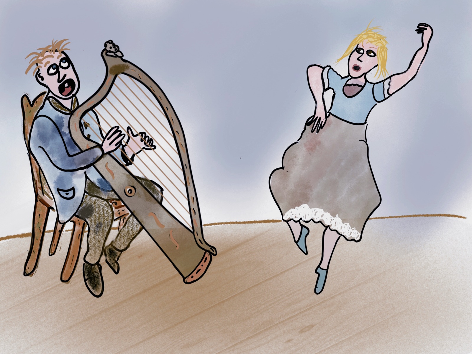 As soon as the harp music began, the bard’s feet began to go up, and his legs to kick and whirl. The more Morgan played, the madder the dance and the wilder the antics of the crowd. The bard had to join in the merriment, for he could not help himself. Soon they all began to spin round and round on the flagstones in front of the door, as if crazy. They broke soon broke the garden fence. Then they came into the house and knocked over the chairs and sofa, even when they cracked their shins against the wood. They bumped their heads against the walls and ceiling, and some scrambled over the roof and down again. The bard could no more stop his weary legs than could the other lunatics.