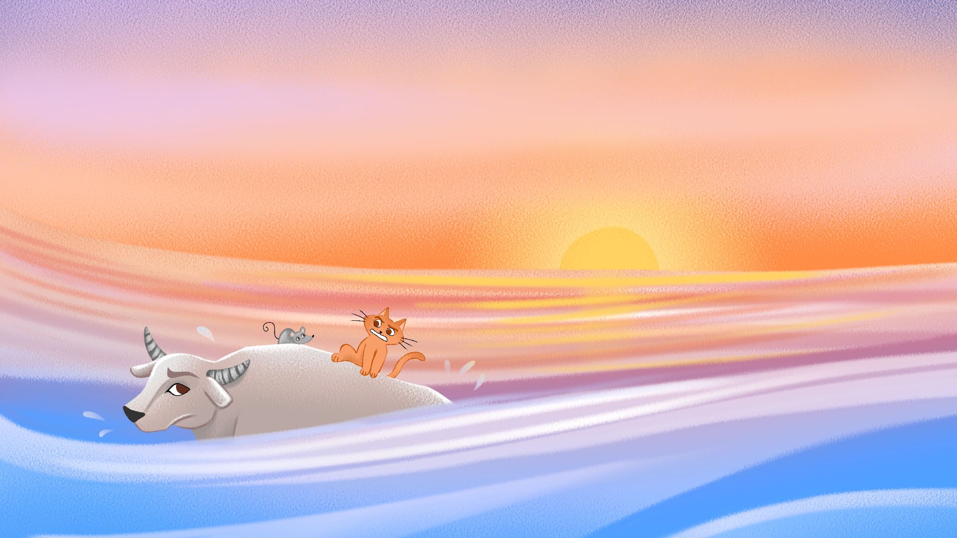 Fortunately, the Ox was powerful enough to swim across the current without any trouble, and soon the far bank was in sight. The cat crouched on the Ox’s head and swished his tail. The rat could see that his friend was getting ready to leap onto the bank ahead of them and take the first prize. He became so cross about this, that he pushed the cat into the water. Then he himself jumped onto the bank and won the honour of the first year for himself.
