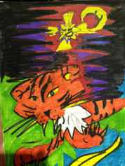 The picture above is a young artist's impression of the Tyger. The vivid colors depicts a "tyger" (Blake's old fashioned spelling) that illuminates the jungle with an orange glow as it moves through the green leaves.