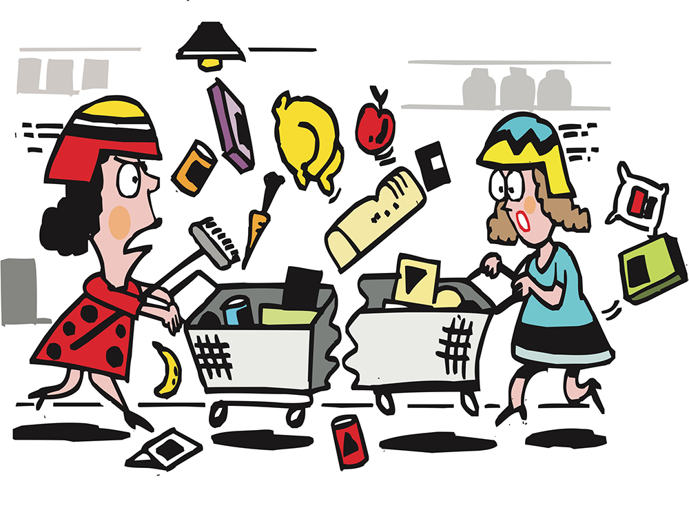 But just as she was swooping in on her prey, another trolley came hurtling towards her from the other direction, vigorously propelled by a demon-eyed lady who seemed oddly familiar.