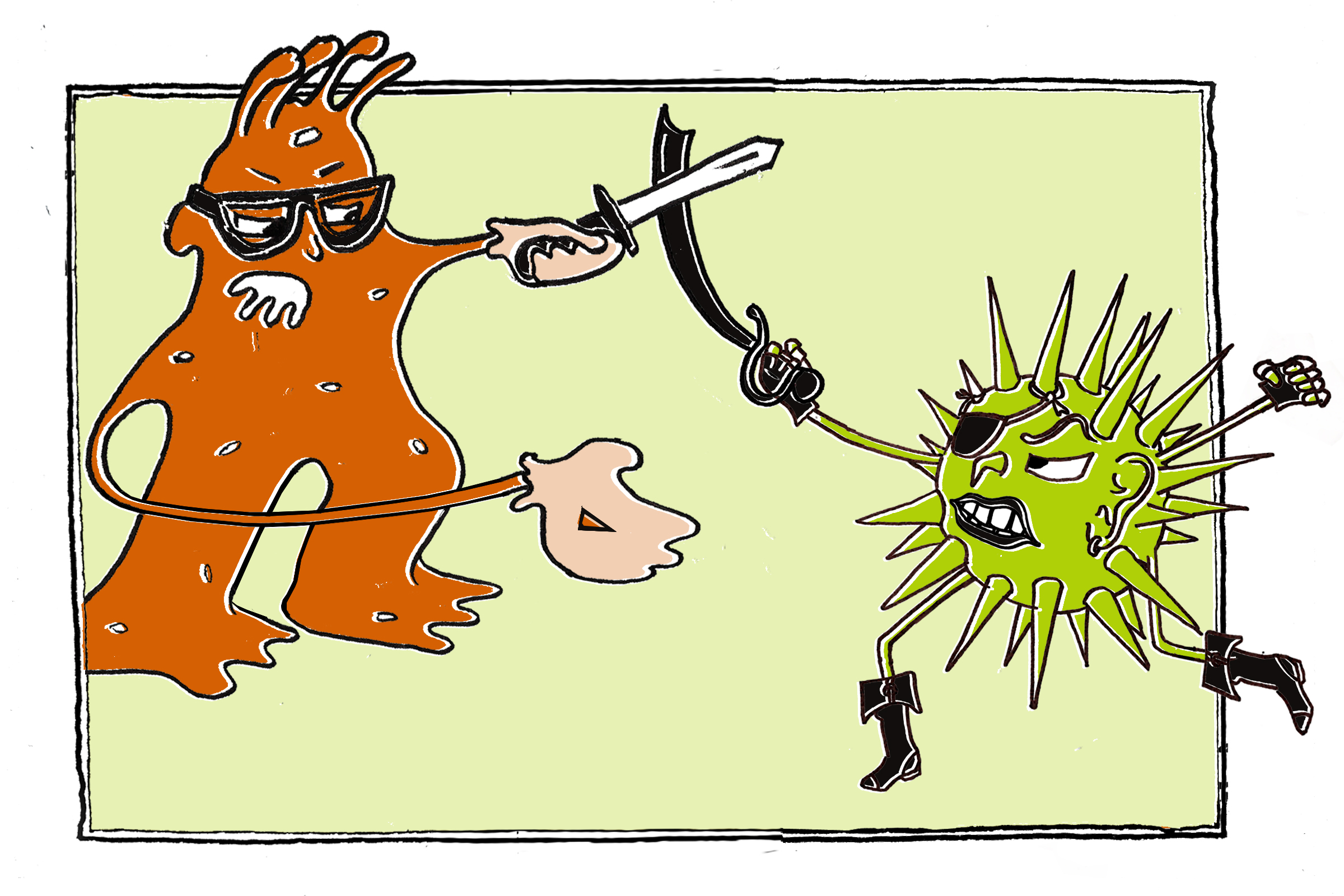 “That’s just what I came up to talk to you about,” said the little cell. “There’s a gang of us that’s ready to take the fight to the enemy. We’re ready to leave your body and raid those viruses wherever they are – hanging around on the taps in the washrooms, lingering around the school kitchens, waiting on door handles. We plan to give them a good hiding.”